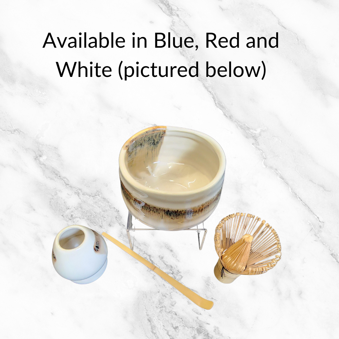 4-piece ceramic matcha set includes Matcha Bowl, Bamboo Whisk, Bamboo Scoop, and Whisk Holder. Available in white, red and blue.