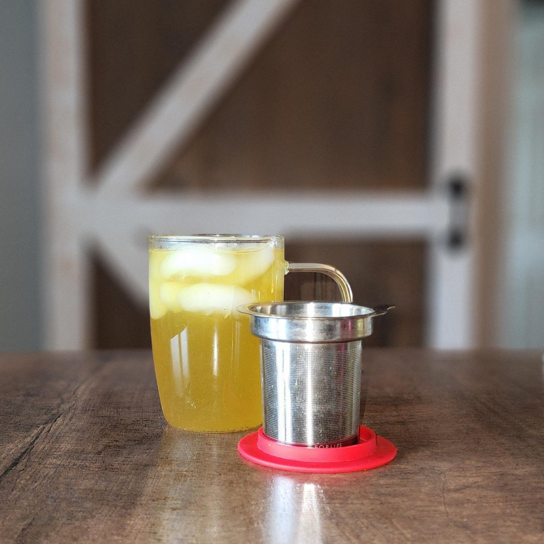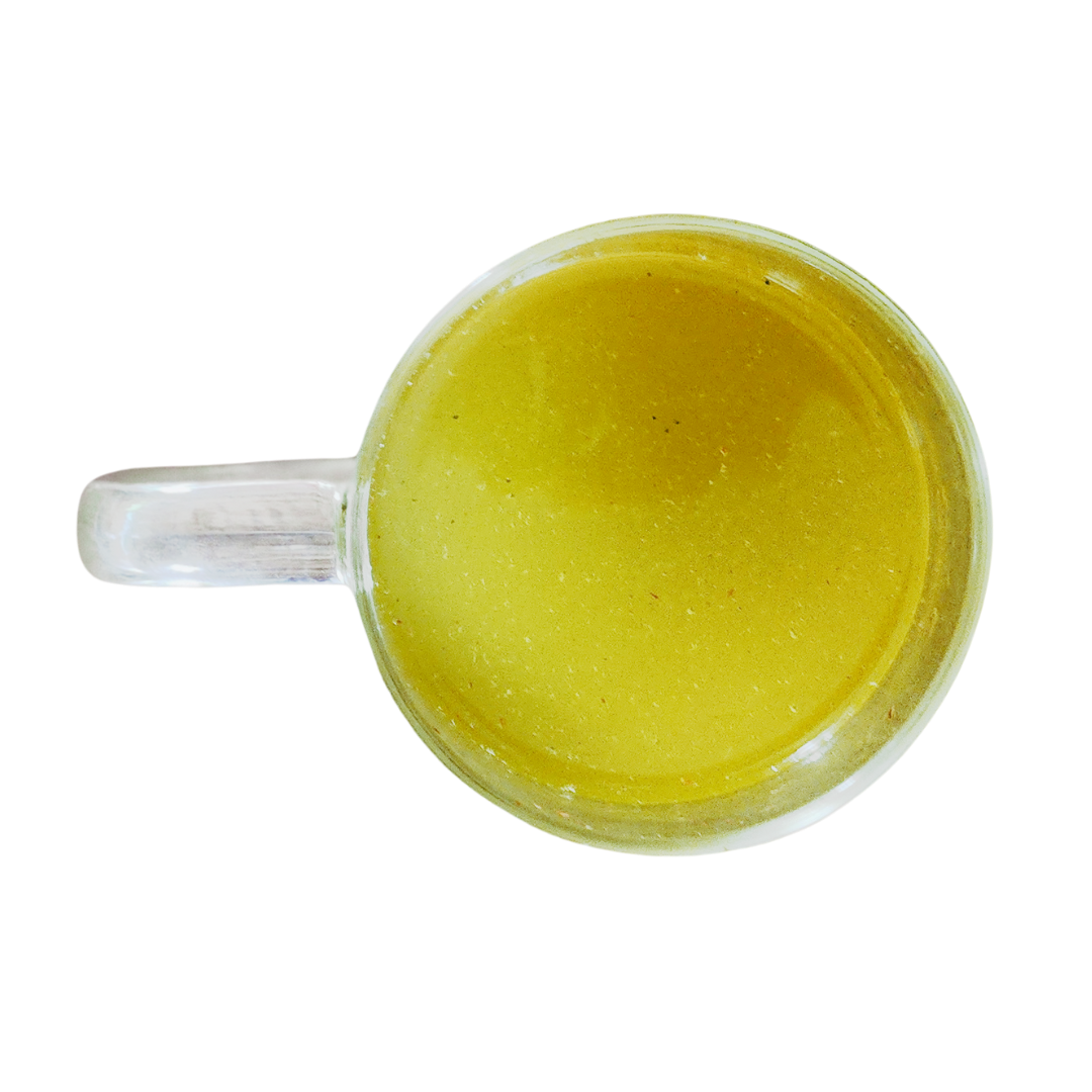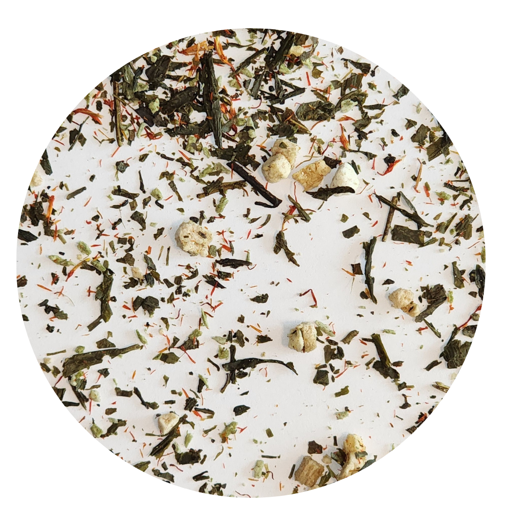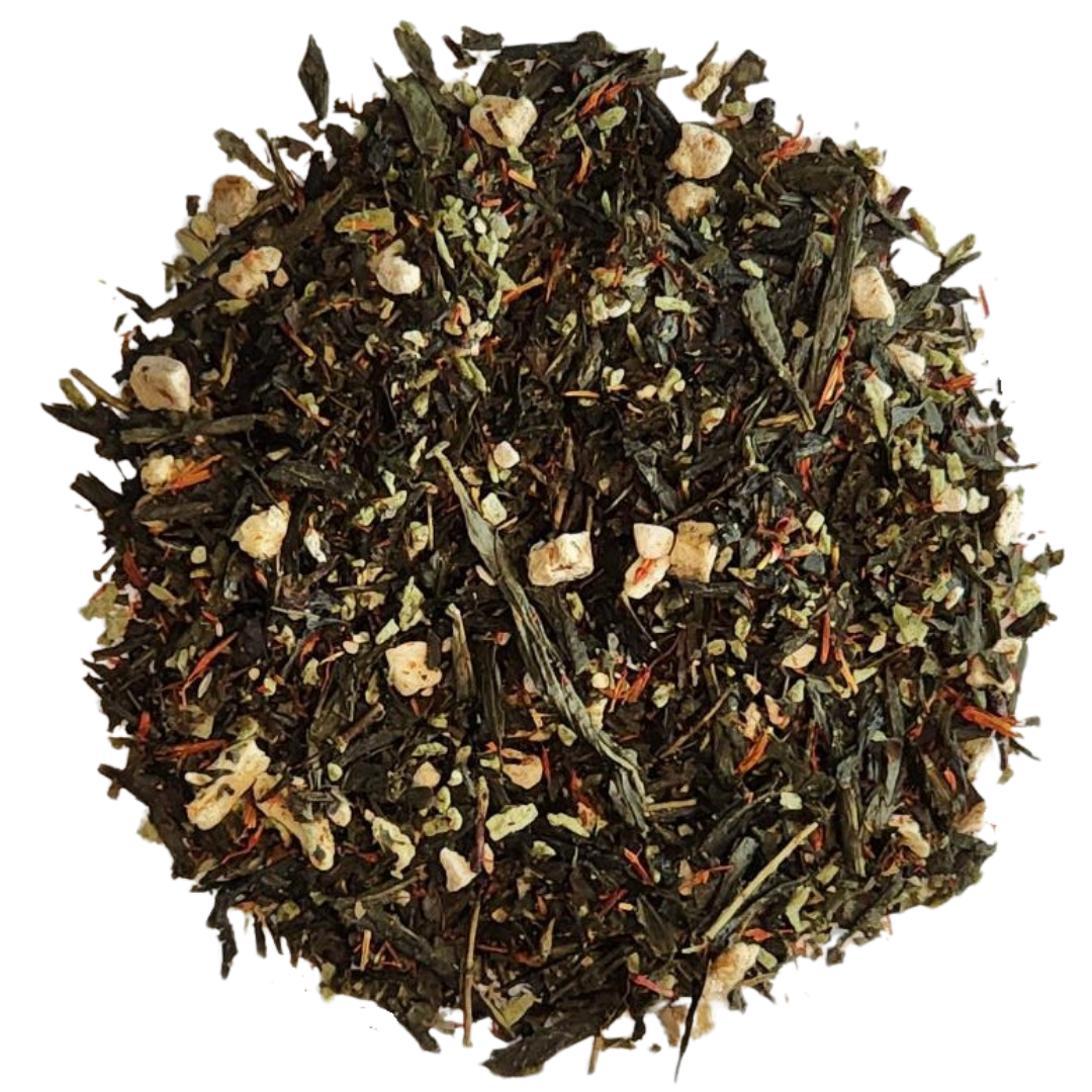 The green tea delivers fresh notes of coconut, juicy pineapple and sweet creamy banana. The flavor is very clean, balanced and slightly citrus. Blended with banana pieces, natural flavorings and bright safflower gives this beautiful tea a soothing finish. (Contains caffeine)